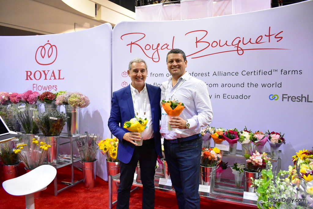 Tom Biondo and Edwin Verdezoto of Royal Flowers holding their new small bouquets for the mass market. All the flowers are grown at their Farm in Ecuador and made at their farm. “The idea here is to offer a small bouquet with unique varieties from Ecuador”, says Biondo. More on this later in FloralDaily.