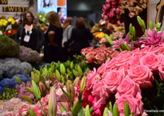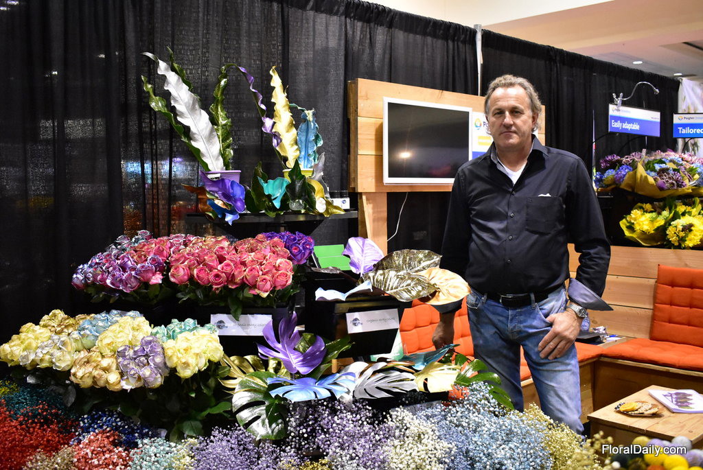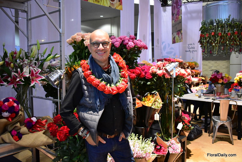 Pieter Landman, creative director at Color Republic, one of the largest importers in Ecuador with own farms. They grow many roses, but also lilies and summer flowers. They supply to US and Canadian supermarkets. Besides selling flowers, they also merchandise, advise, and train in order to    let the flowers sell more easily. The slogan of the company is “A story behind every flower” and this is referring to the feeling that arise when someone get flowers. And at the show, they let these positive feelings arise at the visitors as they handed out necklaces of roses. In total, they handed out 6000 roses.