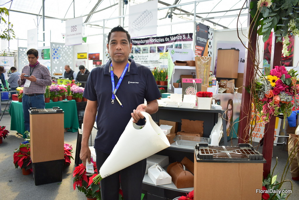 Sergio Olvera Castro of Perfect Pack showing one of their Carton biodegradable, ecological and recycled flower sleeve. Special about this packaging is that water does not affect the packaging. They have 62 models for flowers in their assormtent.