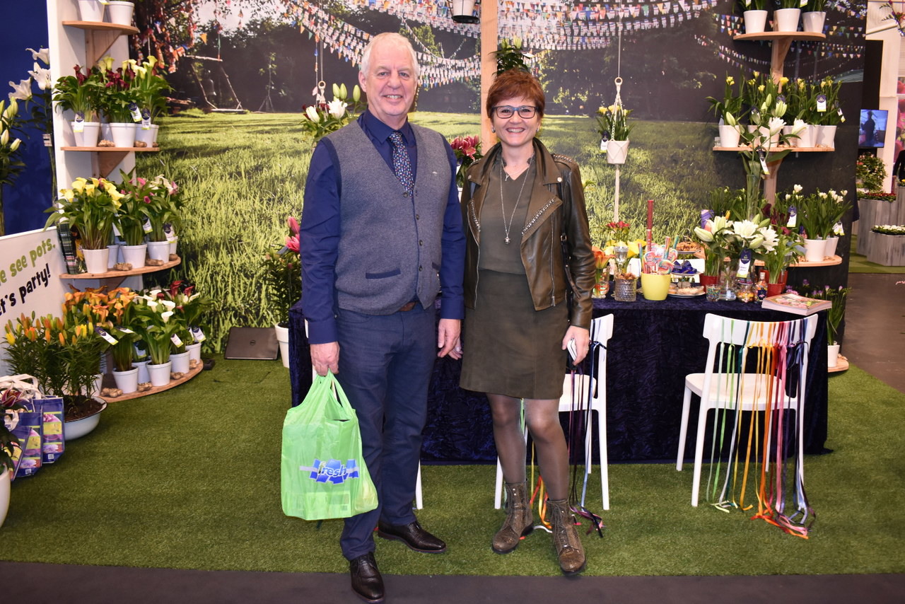 Piet Segers and Loes Beelen of IAA 'International Airfreight Assosiates' visiting the booth of Van den Bos Flowerbulbs.