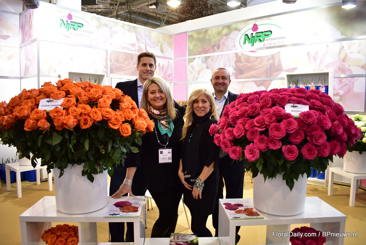 Team of NIRP International. Copacabana (orange rose on the left) and Hotspot (pink rose on the right) take center stage at their booth. Both varieties are doing well in Kenya and South America.