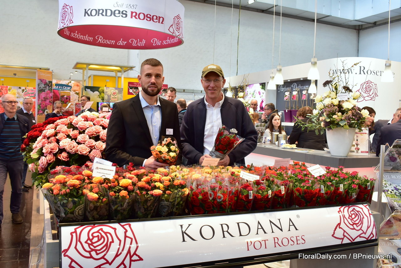 Wilhelm-Alexander Kordes of Kordes Rosen aned Gert Jensen of Rosa Danica presenting 5 new Kordana varieties. Three of the five varieties are red, because red is an important color for pot roses. Danish nursery Rosa Danica will soon put the first new varieties on the market.
