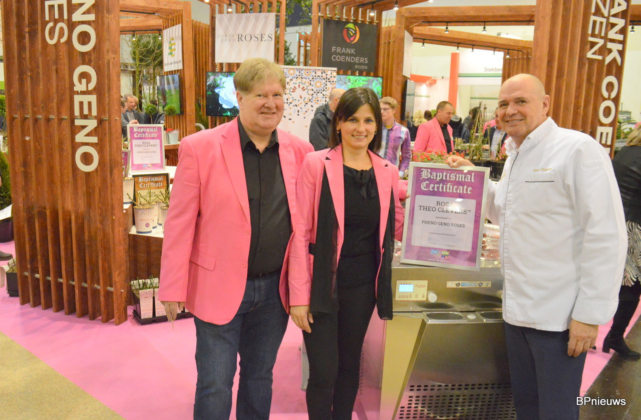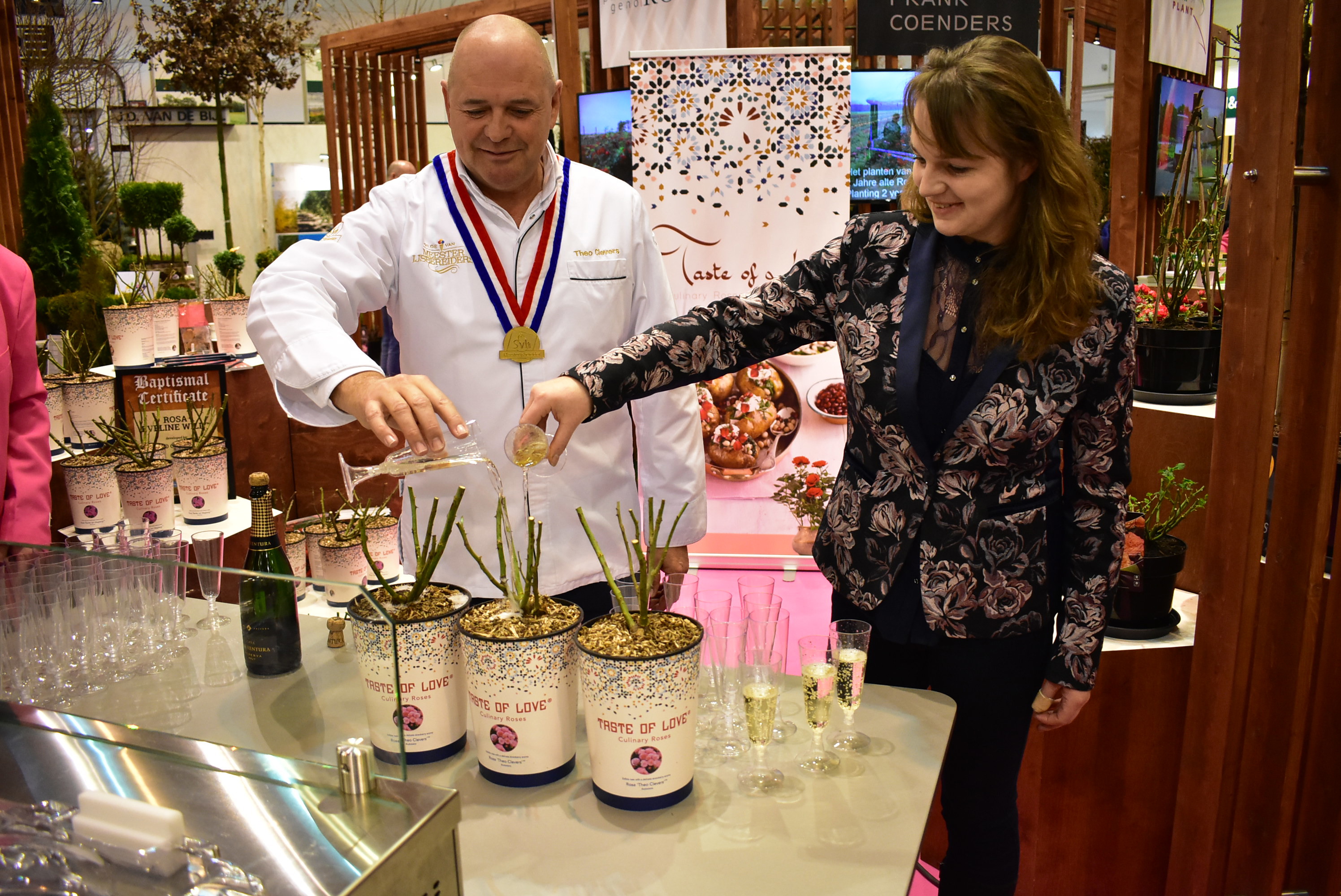 Cook Theo Clevers and grower Willianne Sluiter, from Incredible Roses baptizing the rose named The Clevers.