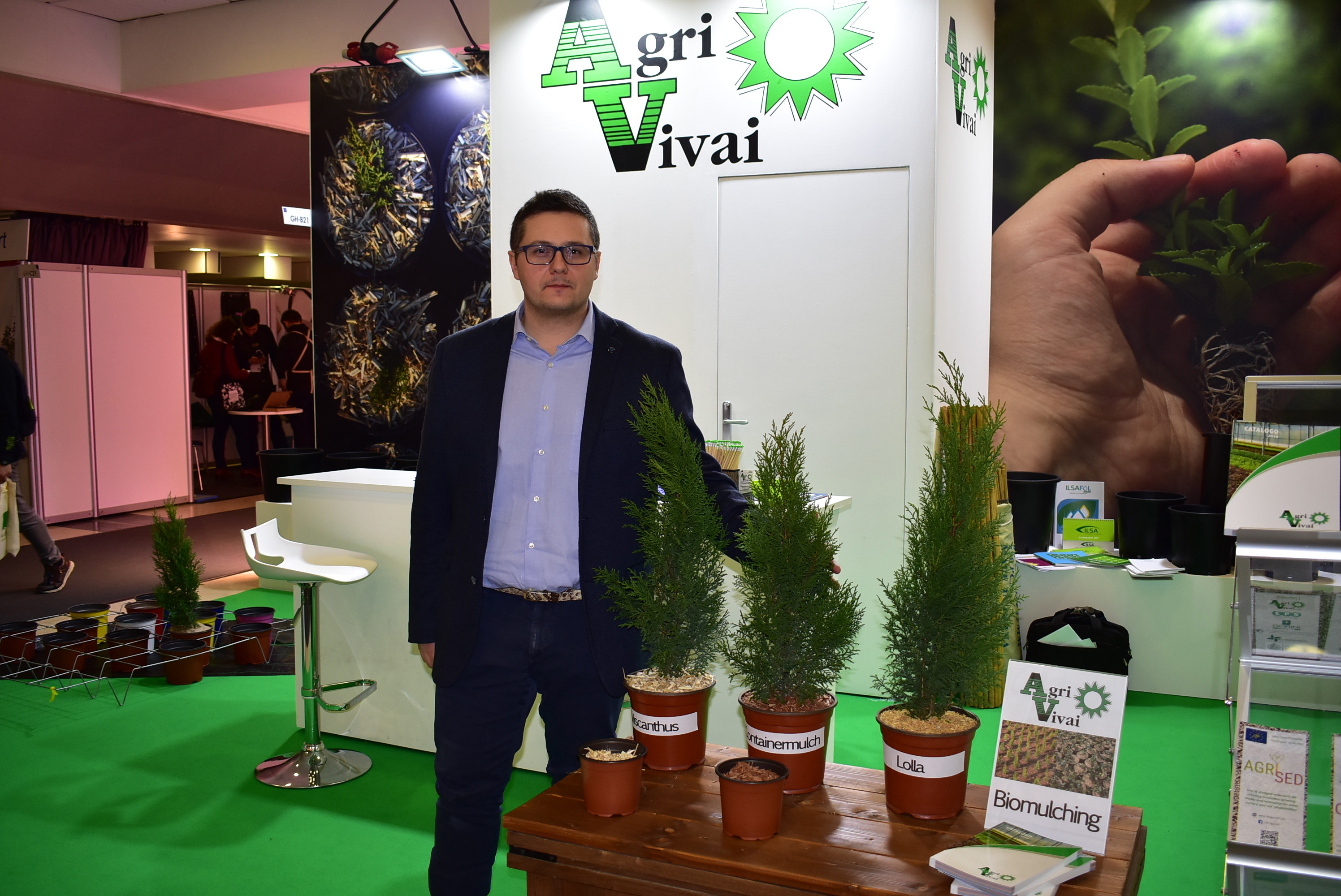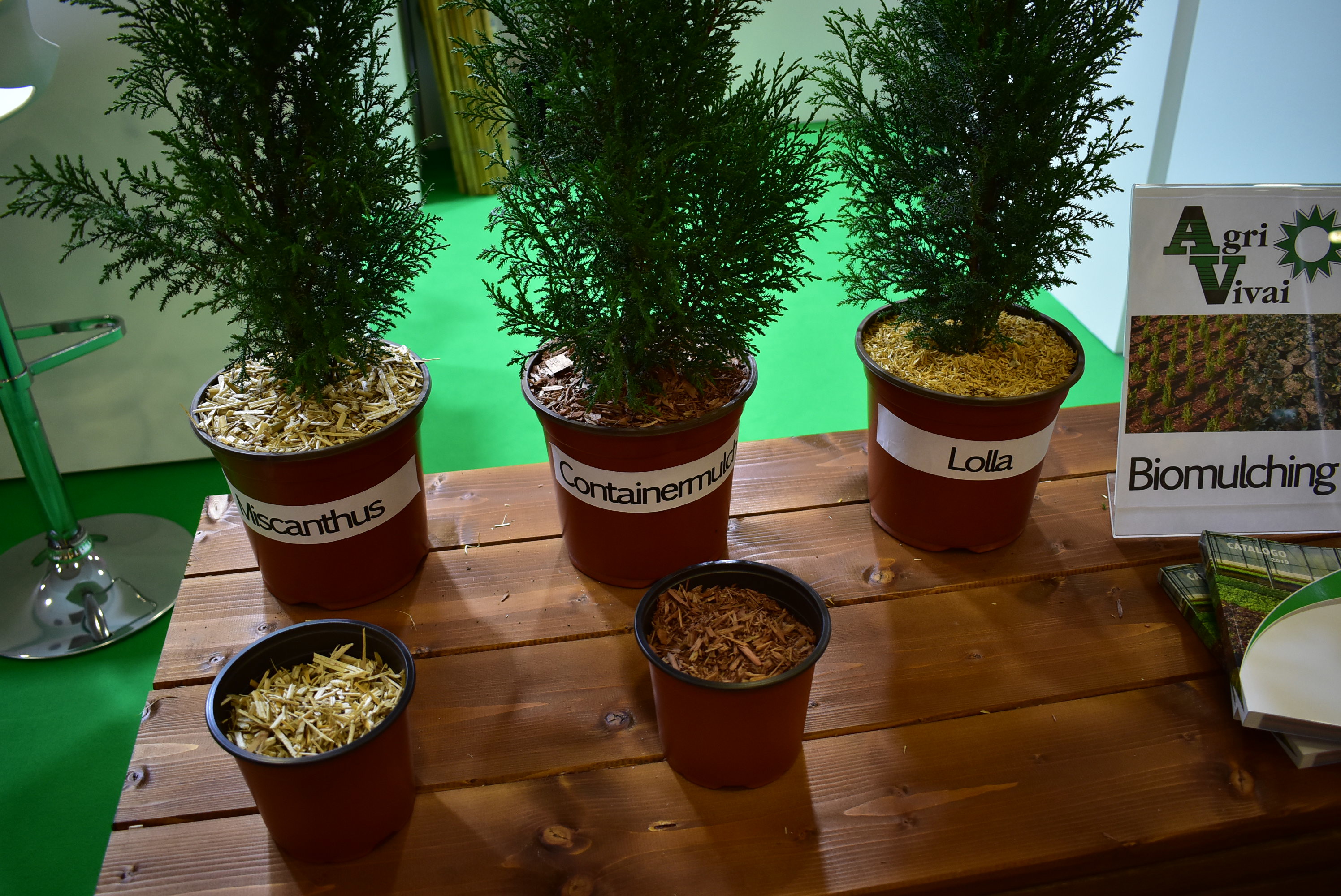 Giancarlo Bercigli of Agri Vivai presenting 3 different types of biomulching for pots.