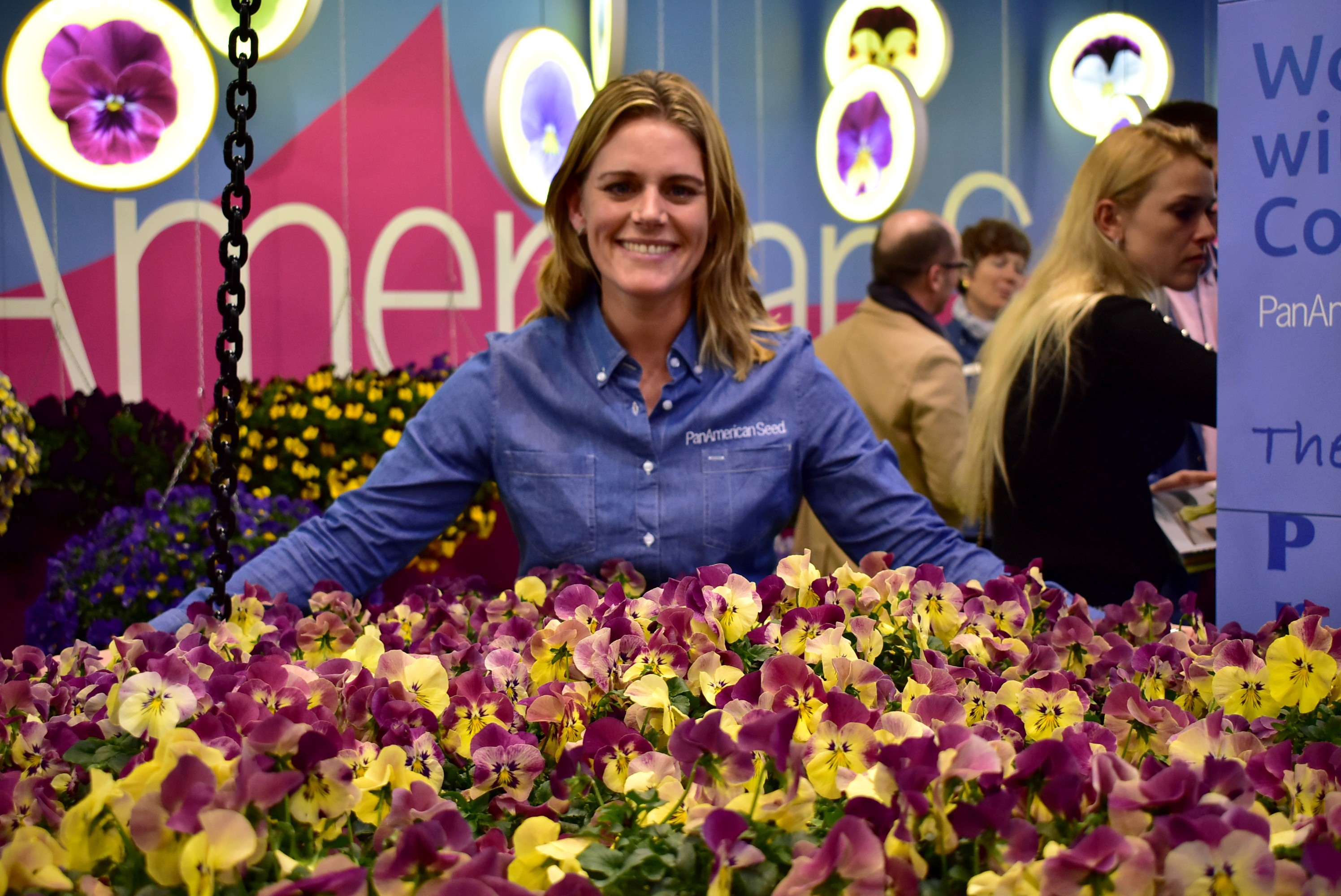Louise Jepsen of Knud Jepsen next to the Kalanchoe Exotic Orange Meadow, a variety participating in the IPM Essen Novelty award.
