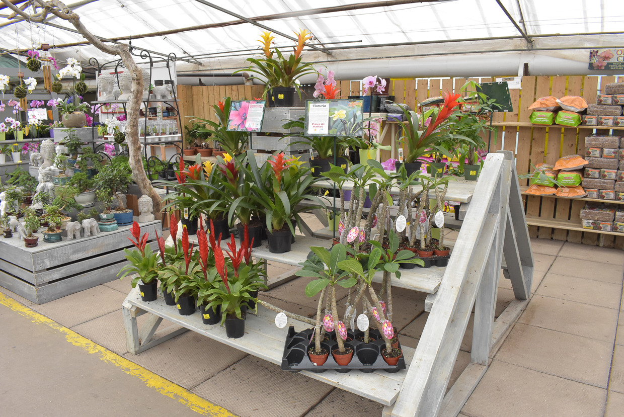 Tropical flowers being advertised included plumerias and bromeliads.