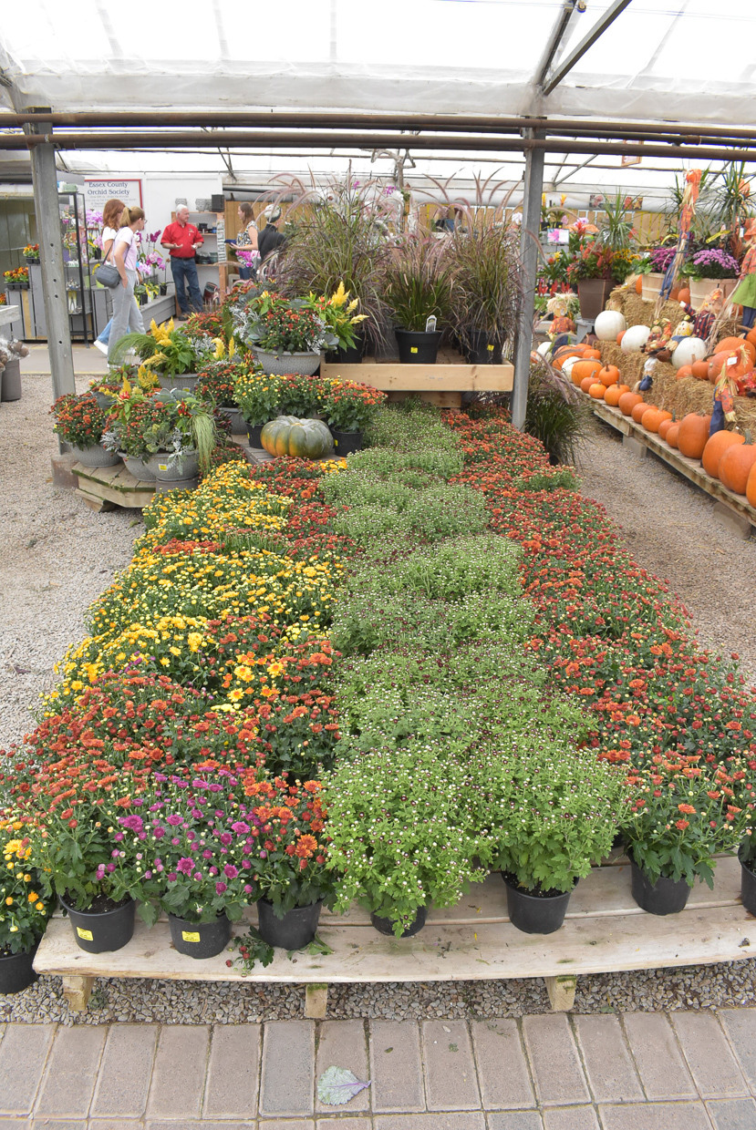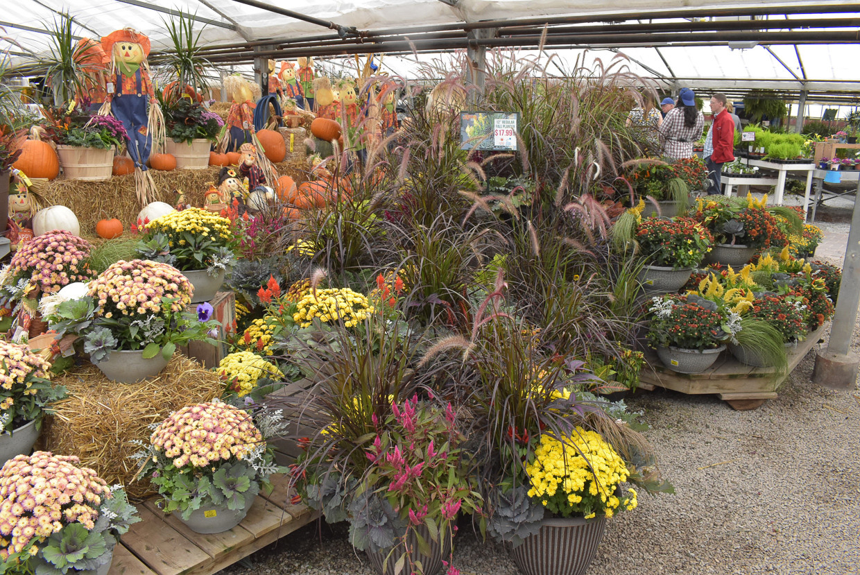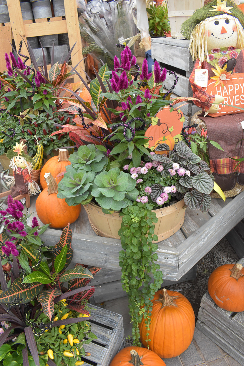 Autumn display featuring potted mums and celosias
