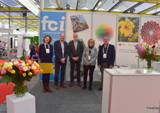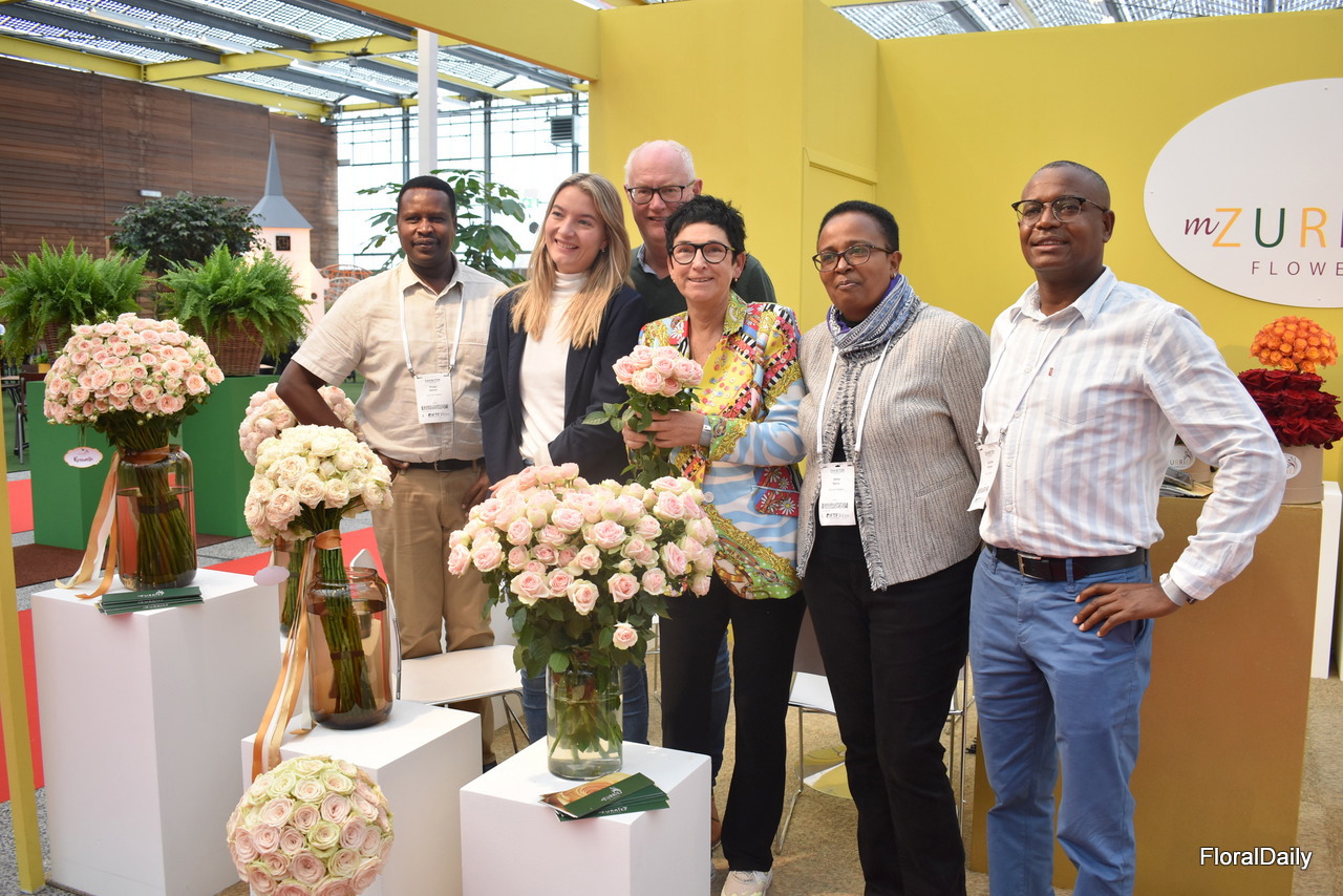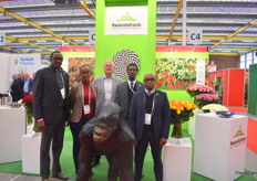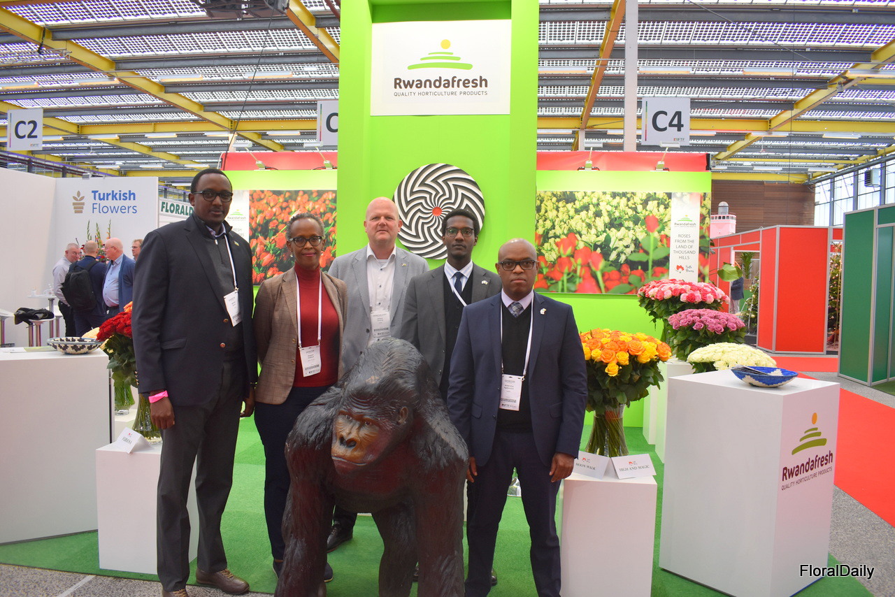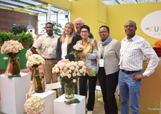 Rwanda Fresh's booth created an opportunity for international buyers to come in contact with Rwanda's rose producers. From left to right: Michel Sebera (Embassy of Rwanda in The Hague), Jeanine Kayihura (Bella Flowers Rwanda), Willem Versteegh (Embassy of Rwanda in The Hague), Jean Hugues Mukama (Embassy of Rwanda in The Hague), Ambroise Ngabonziza (Embassy of Rwanda in The Hague).