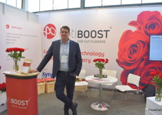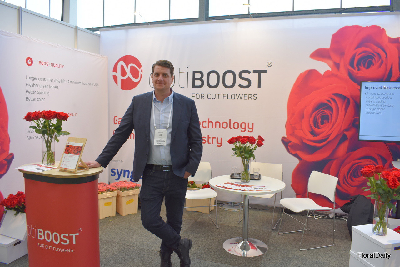 Jonas Lundh at the OptiCept stand. Their OptiBoost machine increases the vase life by 50% on average.