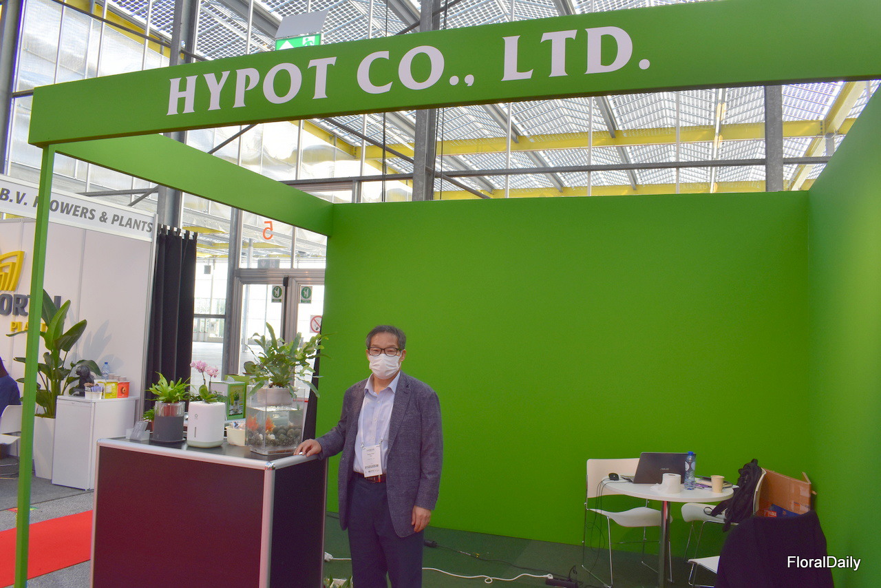 Sang Chul, CEO of Hypot, showing their new products. The product on the right is an aquarium and plant pot in one. Because the water circulates from the aquarium to the plant, it is actually beneficial for the plant's growth.