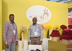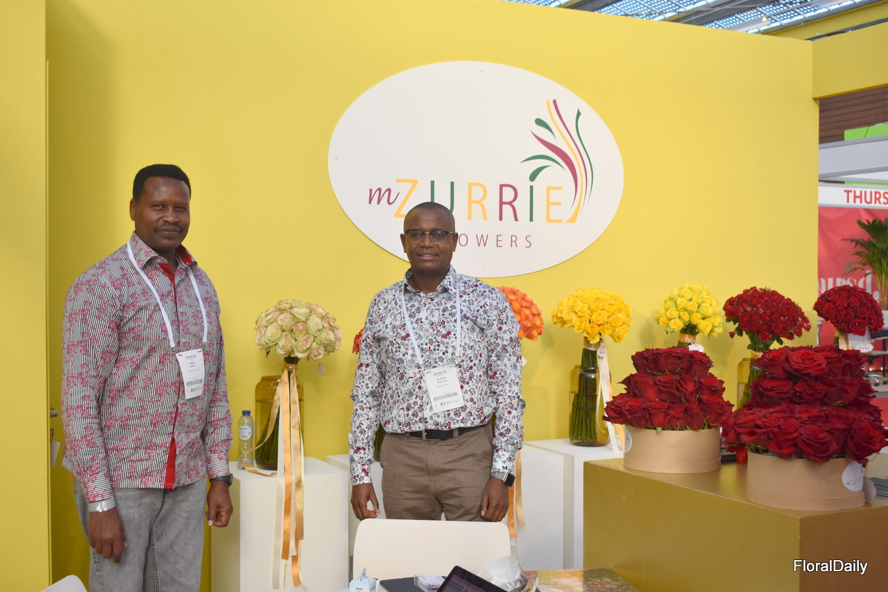 Peter Kemei and Andrew Wambua at the mZurrie Flowers stand. The Kenyan flower growers were busy all day with client meetings.