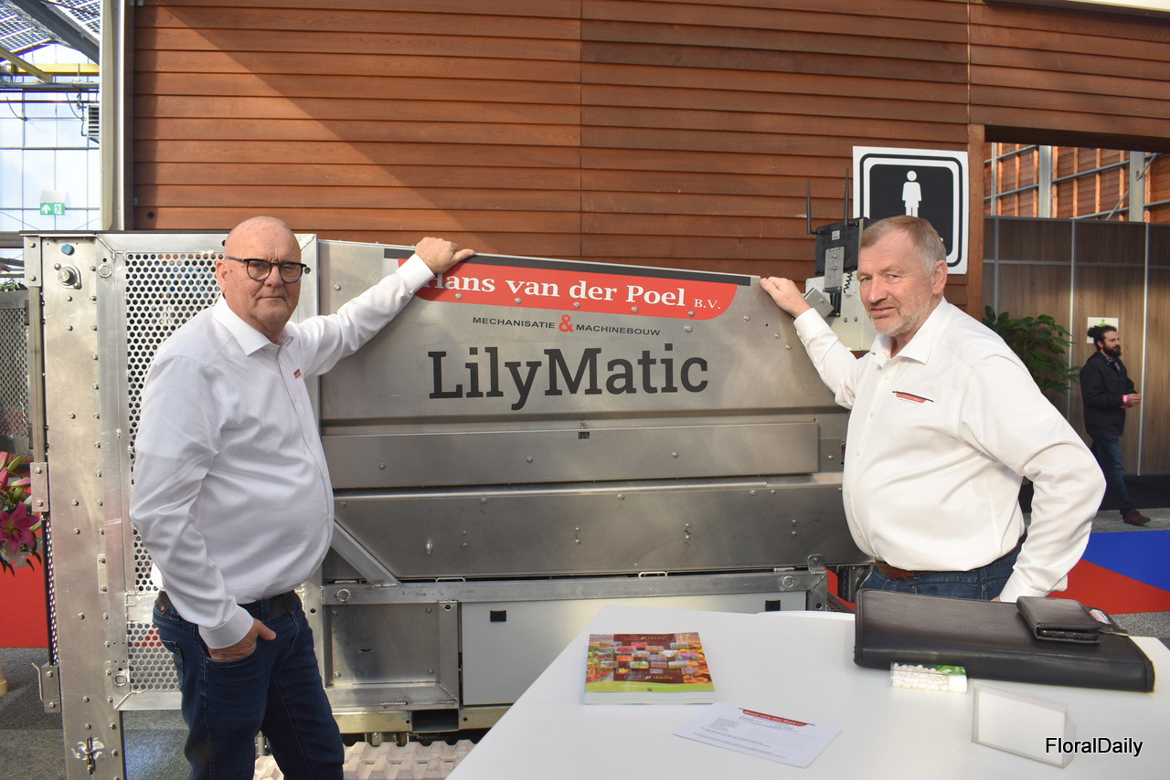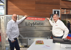 Hans van der Poel and Herman van der Jagt showing their new LilyMatic machine. The machine will be going to Dutch plant nursery Qualily, which has been switching to automation within 1 year, with the help of Hans van der Poel's machines.