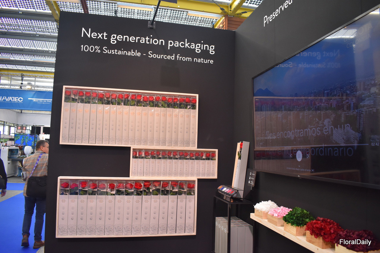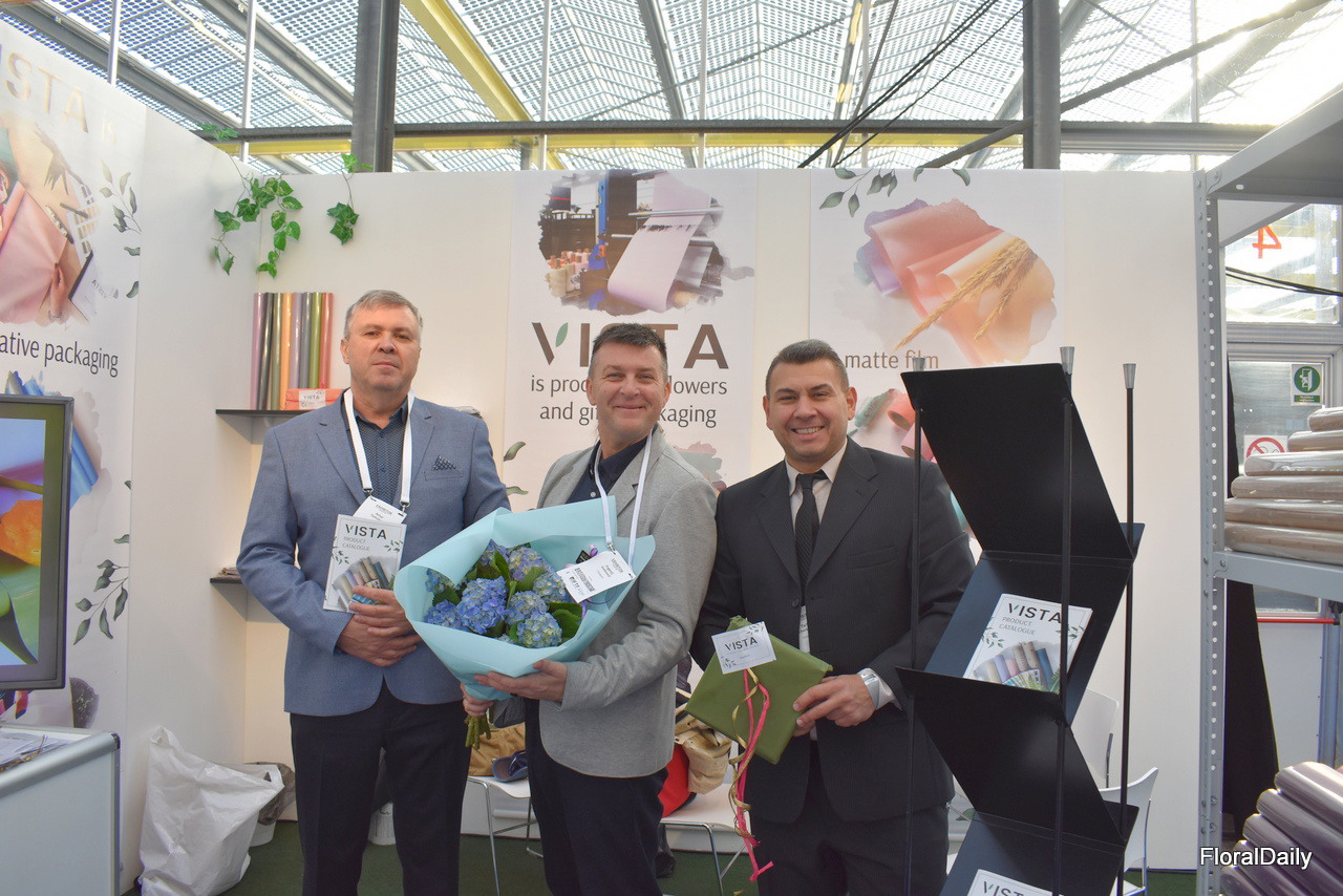 Artur Tamulionis, Evgenij Gutkovich and Tarik Cherkaoui showing their Vista packaging, with new colors and patterns. Evgenij Gutkovich shared that because of the increasing demand in flower bouquets, more people are interested in their colorful packaging.
