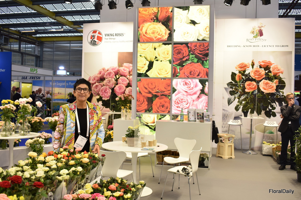 Rosa Eskelund at the Roses Forever/Viking Roses stand. Many new potential customers were interested in their varieties that were on display, so Eskelund had a busy three days full of business meetings.