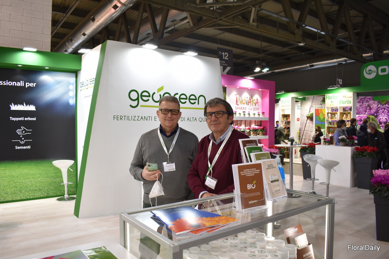 Diego de Zuani and Marco Borberini at the Geogreen stand, showcasing their fertilizers.
