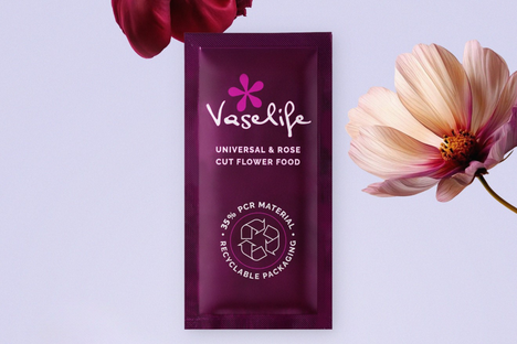 New cut flower food sachets with 35% post-consumer recycled plastic